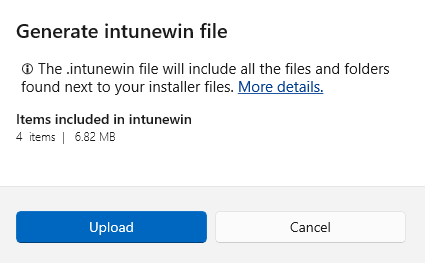 The Upload prompt contains the folder size and number of files included in the .intunewin file – to help avoid cases where more files are accidentally included: