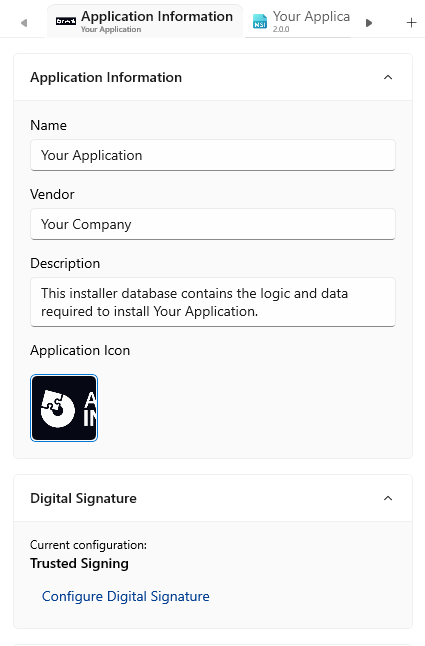 Packit offers built-in support for digitally signing the MSIX packages using Trusted Signing or a Certificate from the Store. To configure the digital signature settings for an MSIX go to its Application Information tab and click on Configure Digital Signature hyperlink: