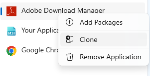 With this option, you can easily update a custom package from your workspace (Winget packages be automatically updated by PacKit); just right-click on a package in the list → select “Clone” from the context menu and pick the new version of your package: