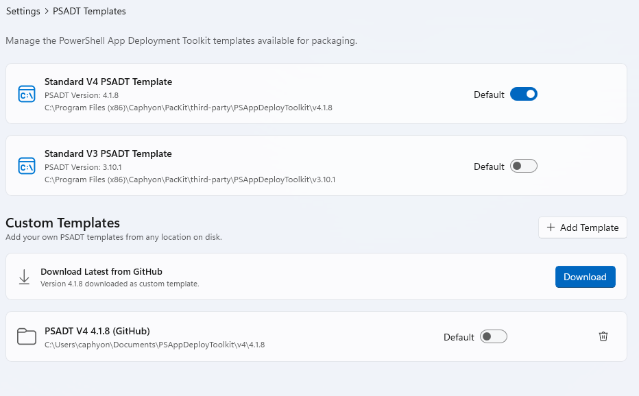 In this section you can add your own custom PSADT template by clicking on [+Add template…] button and picking the folder that contains it.